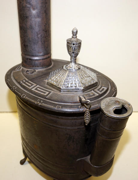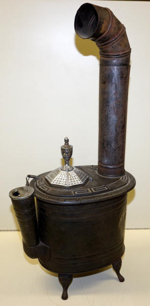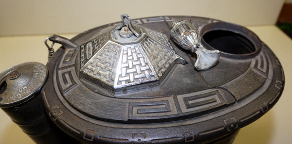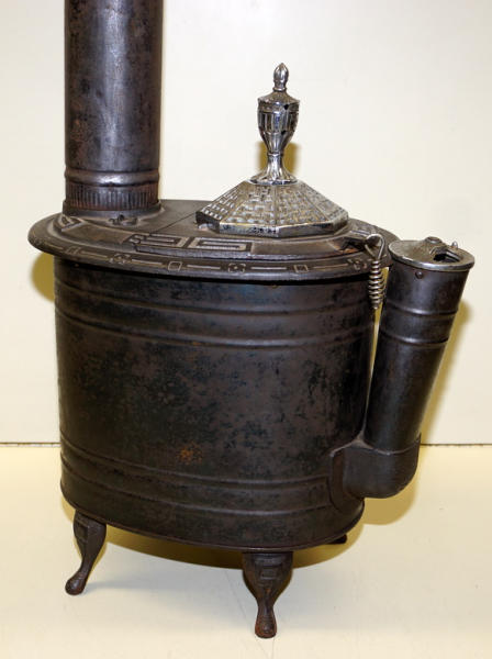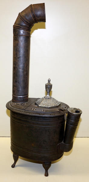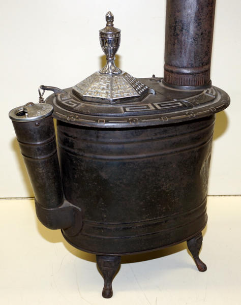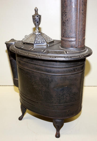 14" long, 15" tall to the top of the finial plus the stove pipe, original nickel plating on the finial & vent; pressed steel base, cast iron top, has a dent in the base, overall clean and nice, unique piece