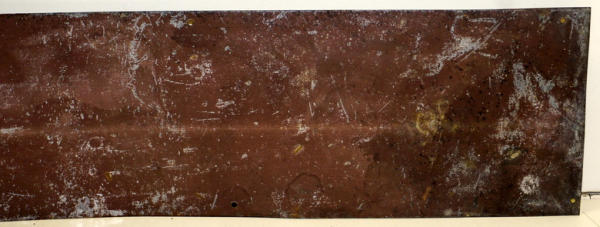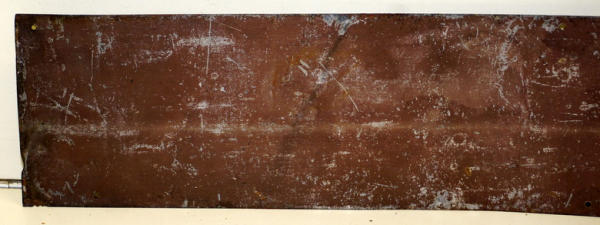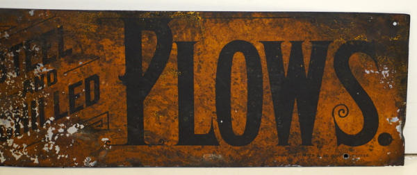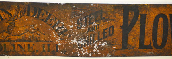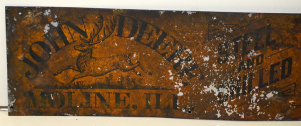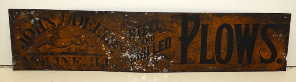 4.75"x20", very early, believe to be Pre-1900's sign, it has a really dark layer on it that might clean off with some work; has some paint starting to flake too, but overall pretty solid; We sold a different one last year in better shape; they were both found during a home remodel; not the best condition; but one of the earliest known John Deere Signs!