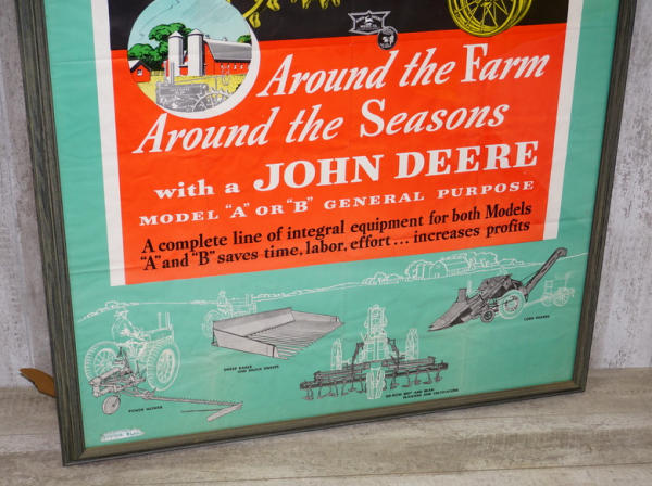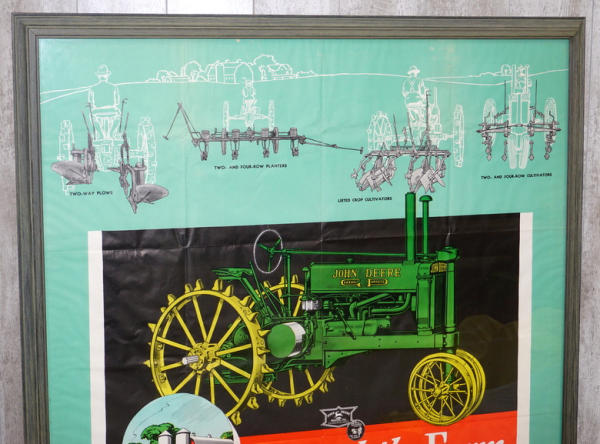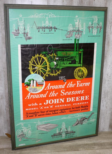 45"x65", professionally framed and glass front, super color, this was never displayed in a dealership; includes the original envelope; large & impressive piece of JD advertising! Has fold marks and a few light age spots, but overall is excellent condition; No shipping, local pickup only