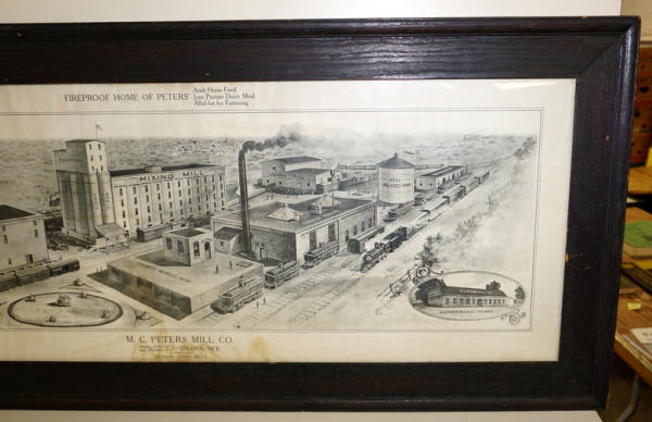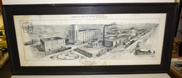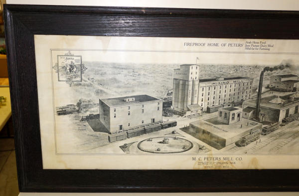 22"x49", great detail with the trains & a horse drawn wagon; no vehicles, so probably around 1900 or early piece, has some water stains and general wear, but a nice look; believe frame is original; great piece of Nebraska Memorabilia!