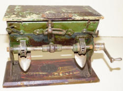 another neat piece, 12" wide, 9" tall, 6" wide; original paint is worn; has an original label on the base, but I can't make out the works, looks like it might be foreign made, unique piece