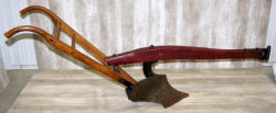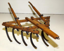 16" long, 13" wide, wood with brass frame and wheels; looks like the harrow was suppose to spin as it was being pulled and then packed; no maker's mark, really nicely done with great patina; never seen anything quite like it! Missing one brass trim ring on the roller, otherwise I believe complete