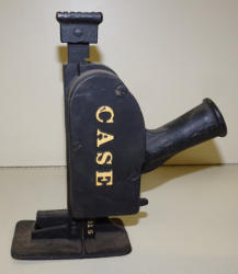 Great piece, cast iron ends with wood sides, has a cast iron door inside to switch the drill from WHEAT to OATS; 7.5" tall, 6"x6" square; original paint is a little faded and worn, but still a great patina;