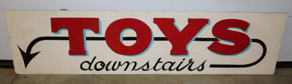 8'x2', older hand painted sign, has some general wear, neat piece for your toy display! No shipping, local pickup only