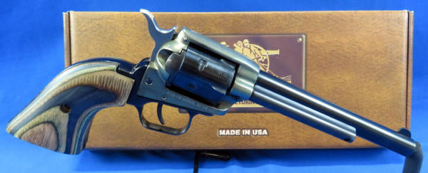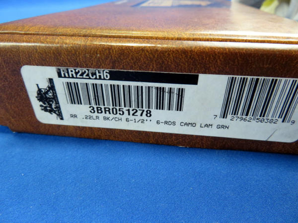 green camo wood grain laminate grips; stainless receiver; 6.5" BBL; appears mint & unfired; original box; made in USA; SN#3BR051278