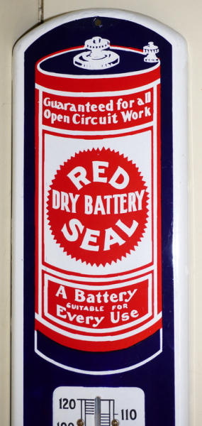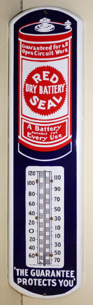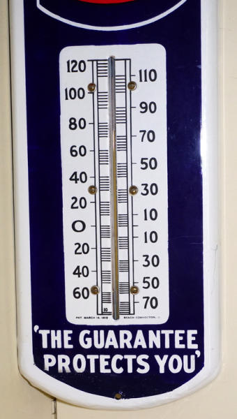 rated 8.75, 27"x7", porcelain thermometer has excellent color and gloss, touched up chips at the mounting holes, tube is good