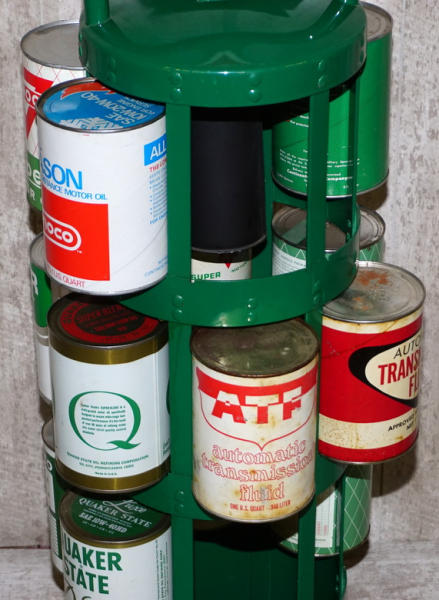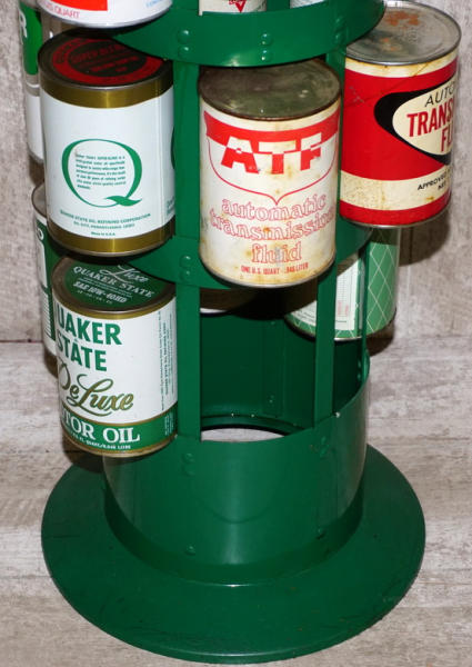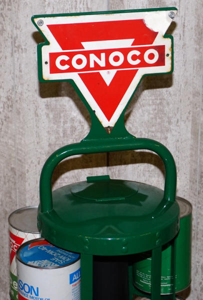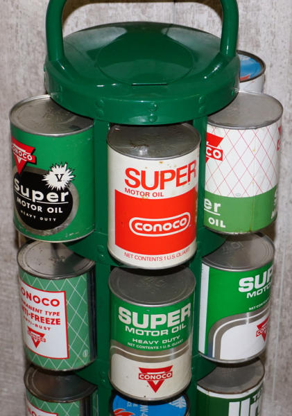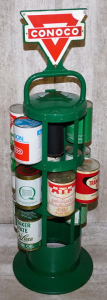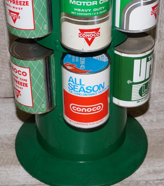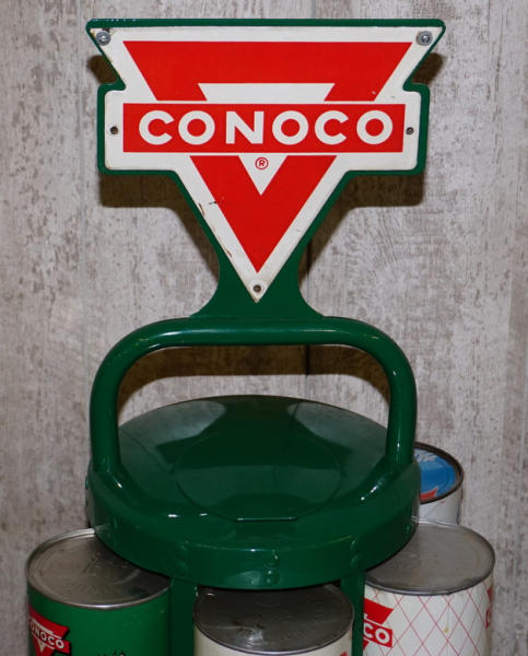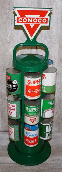 rated repainted stand, 42"T., has two SSP die cut Conoco signs one has chip, comes with 14 cans; sells as a set for one money