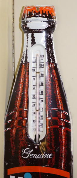 rated 8, 29"x8", metal thermometer has good color and shine, tube is good, has some scratches and some overspray paint on the bottom of the bottle