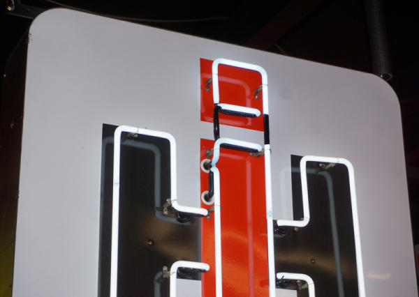 rated 9, 51"x46"; 2-SSP neon sign has good color and gloss, one side has minor rust staining, mounted on original metal can, works; exact size unknown, will be updated prior to the auction; crated