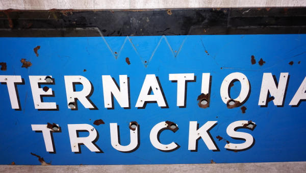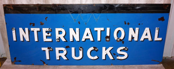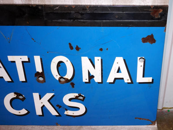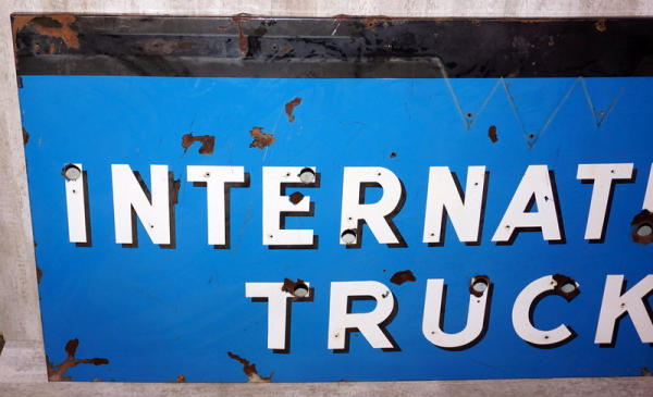 rated 7, missing the logo piece, heavy chips, 36"x90", rare IH truck sign