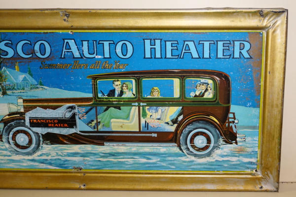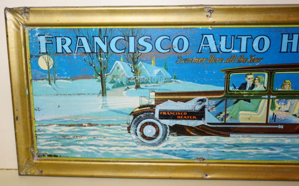 rated 7, 18"x40", SST self-framed sign has good color and shine, has wear, scratches and extra holes around the perimeter, some paint loss on the right edge and frame; not perfect, but a great graphic sign