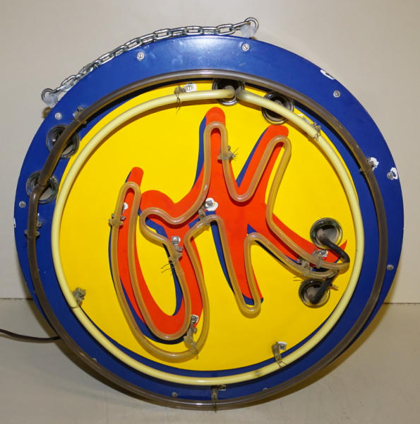 rated 8.75, 24"D., the SSP neon sign has good color and gloss, has tiny chips at a few of the stand holes, mounted on new metal can; crated
