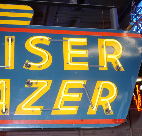 rated 7, 43"x76"x16"; 2-SSP die cut neon sign has lots of touched up chips and damage, mounted on a new metal can;, crated