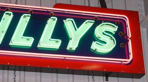 rated 8.5, 27"x6'; SSP die cut sign has very good color and gloss, has touched up chips around the perimeter, mounted on a new metal can, works; crated