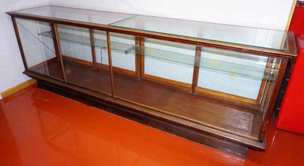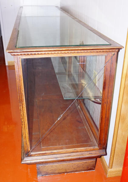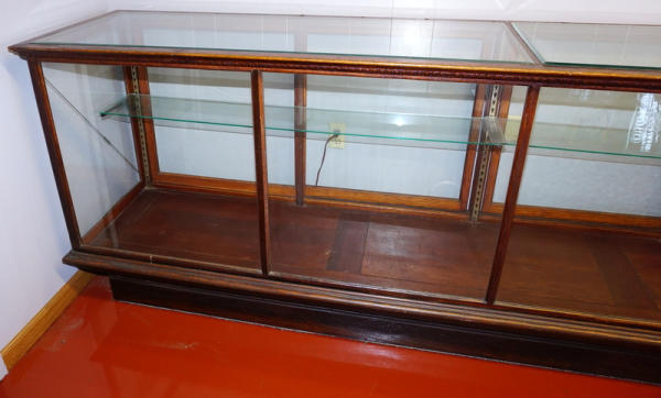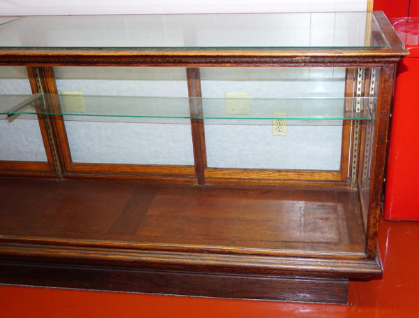 26" deep, 42" tall; old original, 1 row of glass shelves, beveled glass top; Pickup in Worthington, MN only