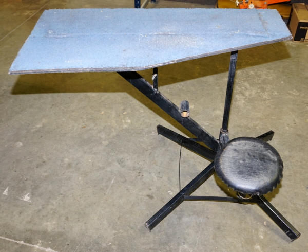 folds up to store flat; hand made but very well built; wood table top, padded stool; top is 40" long, 34" tall
