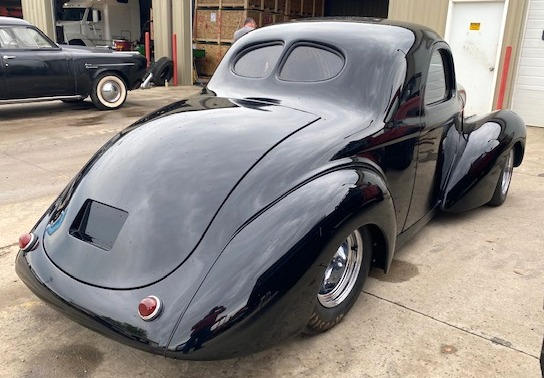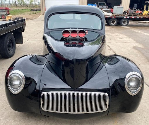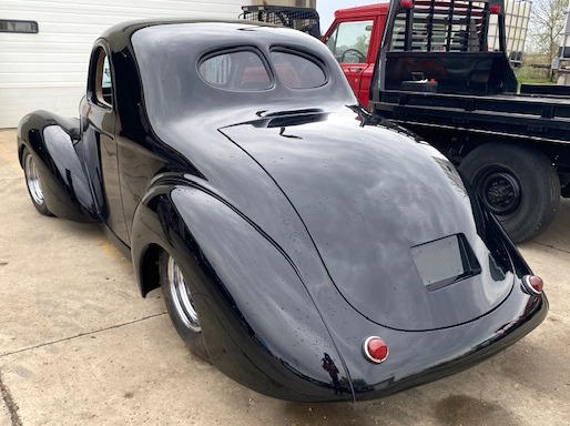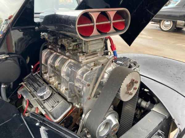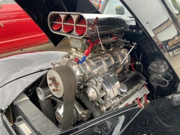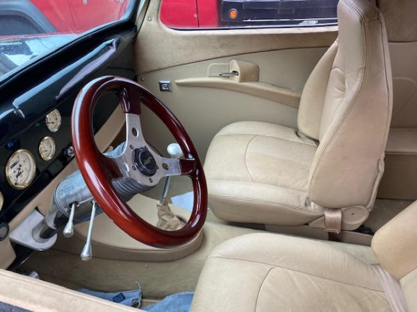 Fiberglass body, auto, 500hp small block Chevy w/ 2 4bbl’s & Blower, black w/ cream leather interior, auto-meter gauges; has title