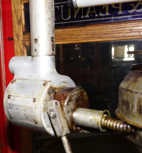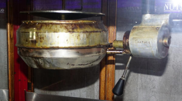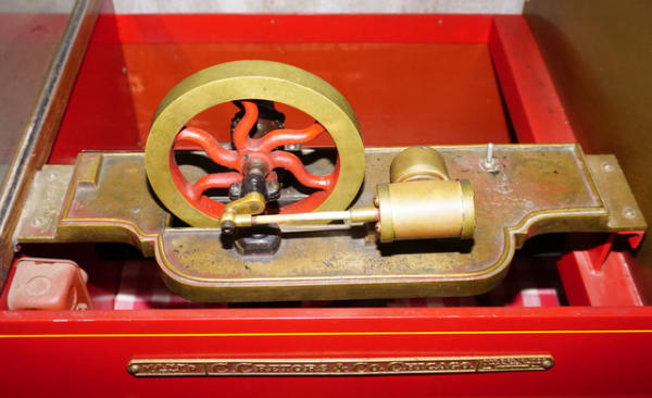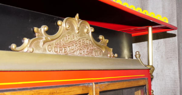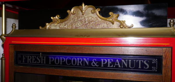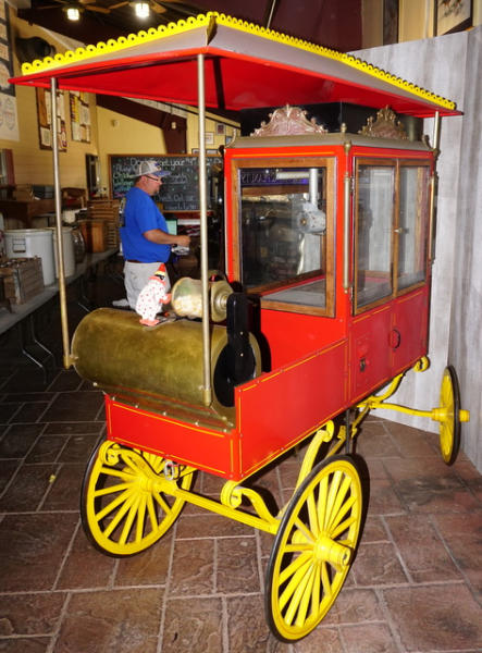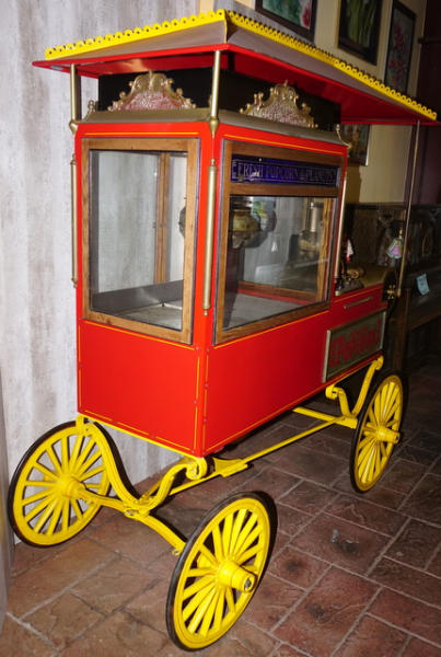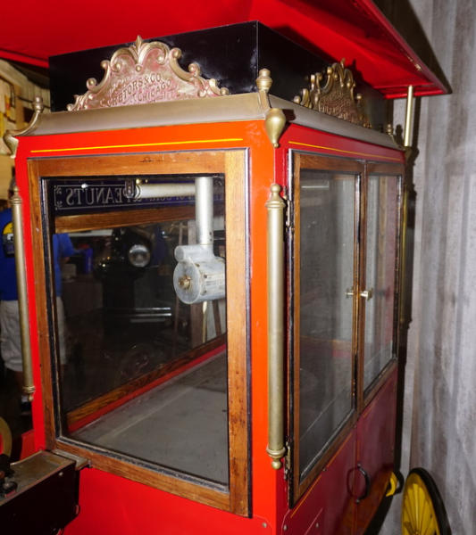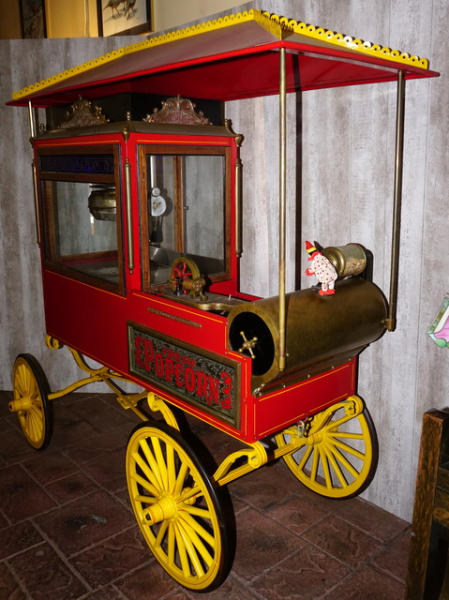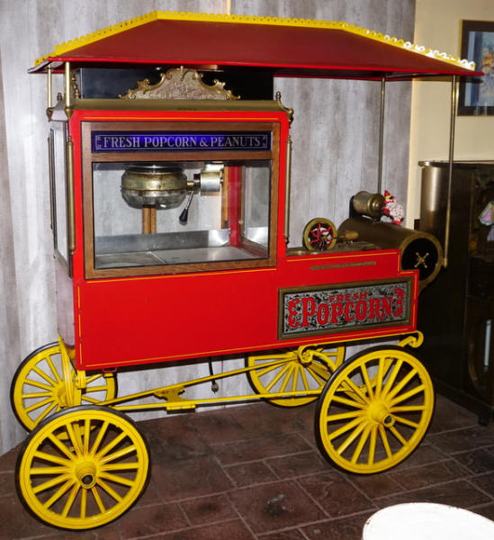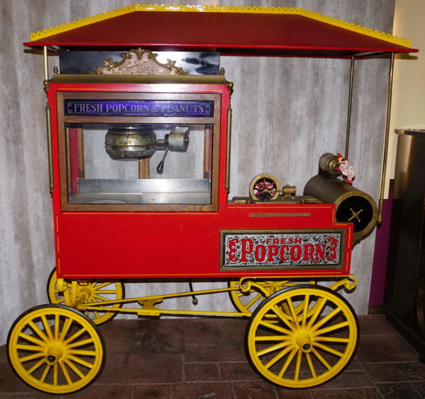 Completely restored, full size wagon, brass engine, & roaster, beautiful glass work, blue etched glass header above the popper, wood spoke wheels, all restored & super sharp, about 7' long, 3.5' wide, and 8' tall; museum quality piece; I talked to the original owner on this and most of this wagon was built by Hansen Wagon of Mitchell, SD