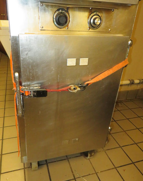 will warm but won't cook; bottom unit does not function; on wheels; 23"x30"x77"