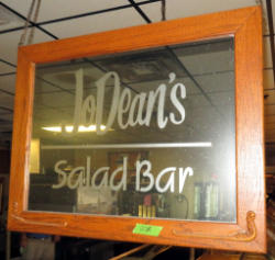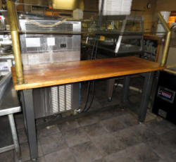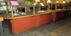 this was the main salad bar in the restaurant for over 20+ years! Brass rails holding glass sneeze guard; laminate top has some chips and edges missing; wooden base; one end does hold hot food; buyer is responsible for dismantle and removal;