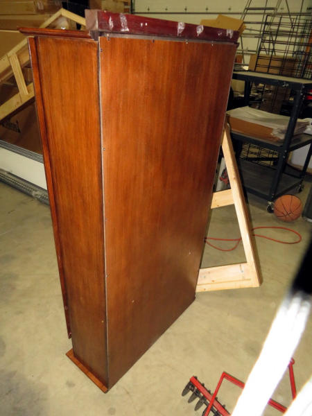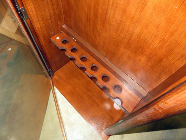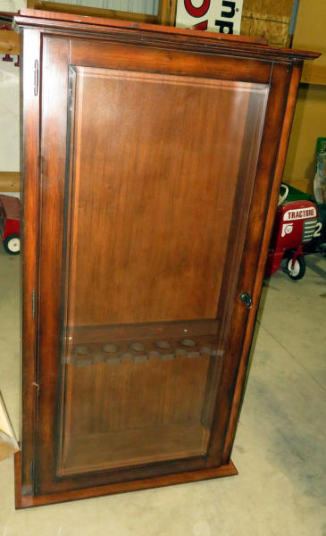 has glass door w/lock & key; guns double up inside; picture is of cabinet upside down, due to the brace on the bottom, won't stand up right side up; very nice; measures 29"x11"x55"; NO SHIPPING, local pickup only
