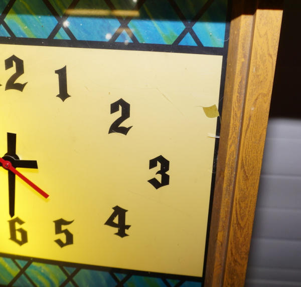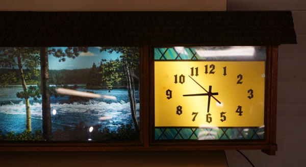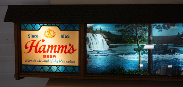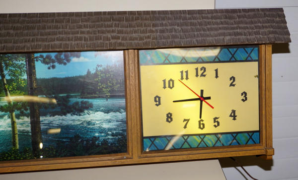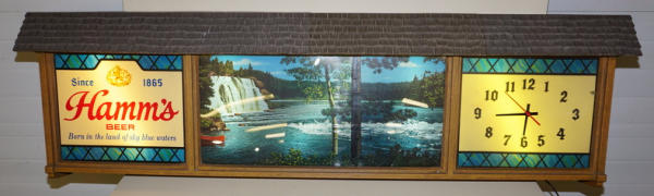 66" long, 19" tall, lights up and motion works, believe the clock works too, small chip on the corner of the roof, otherwise some normal wear, but overall a nice original & hard to find sign; no shipping, local pickup only