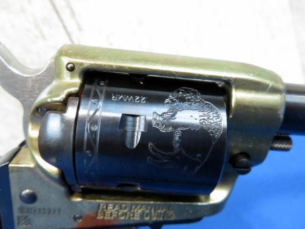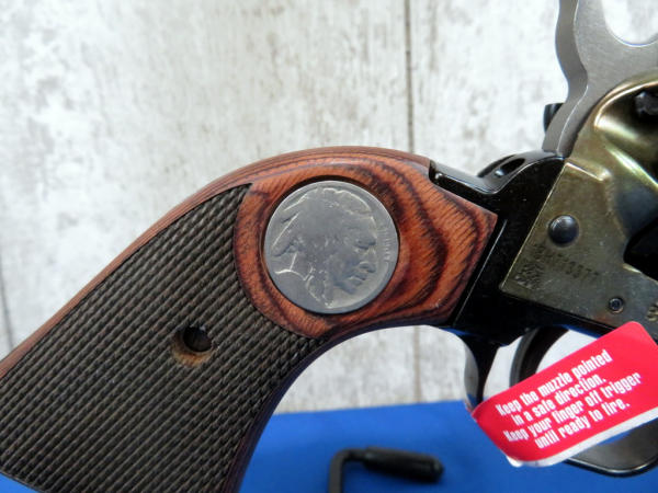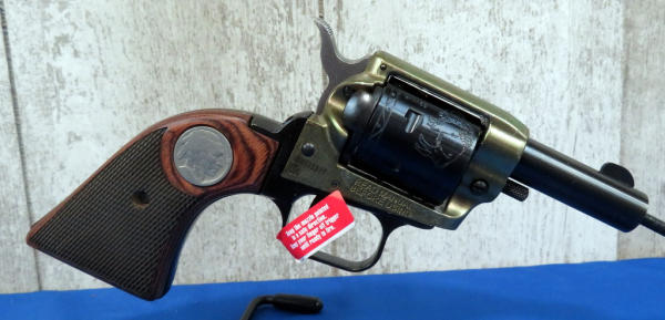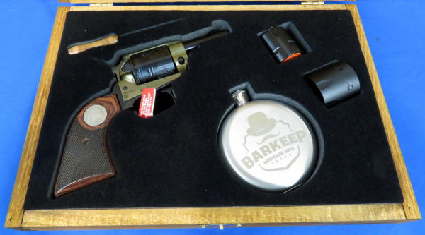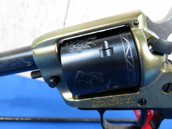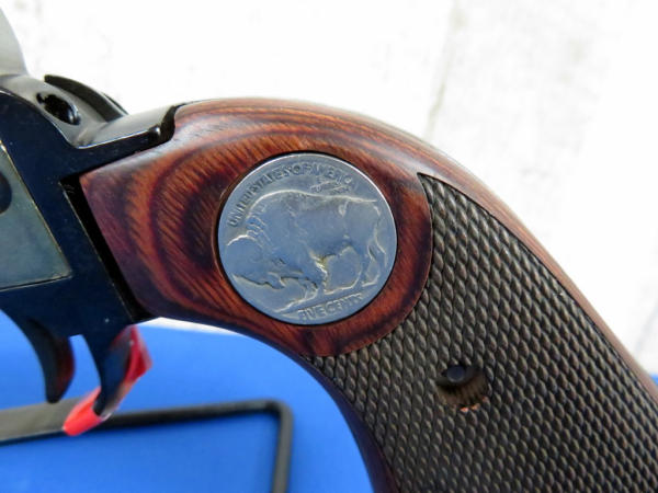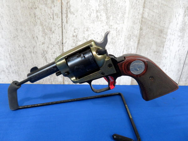 has a nice presentation wood case and original box; includes flask, LR cylinder and an engraved WMR cylinder w/buffalo graphics; has two Indian buffalo nickels in grips; case hardened frame; 2-5/8" BBL; nice set; SN#1BH713377