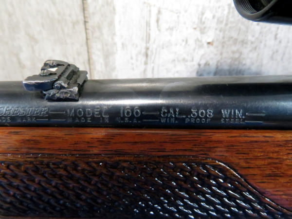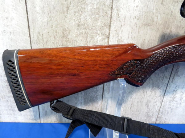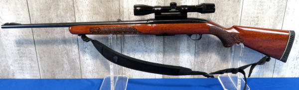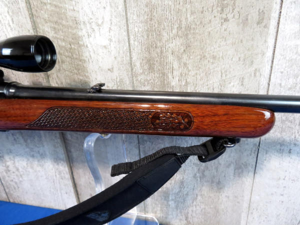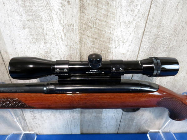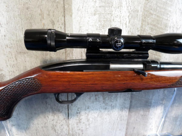 22" BBL; high gloss finish to stock w/basket weave checkering; Bushnell Scopechief IV 4x scope; sling; removable magazine; nice gun; SN#72309