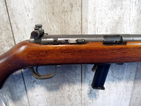 not sure we've had this gun before; 23" BBL; sling; removable magazine; Redfield Peep Sight; bluing is thin; wood is nice; interesting firearm; SN#10164