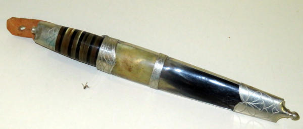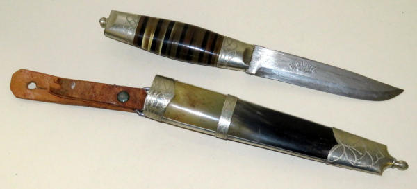 amazing detail and look; condition is very nice; horn sheath; not sure if it's silver but looks like it; stacked plastic handle; 4" blade; neat piece