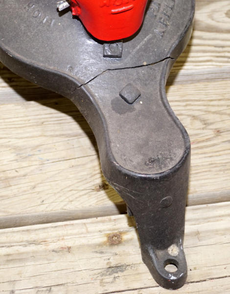 31" tall, good repaint, one leg has been broken and repaired with a plate, looks like an old farmer repair