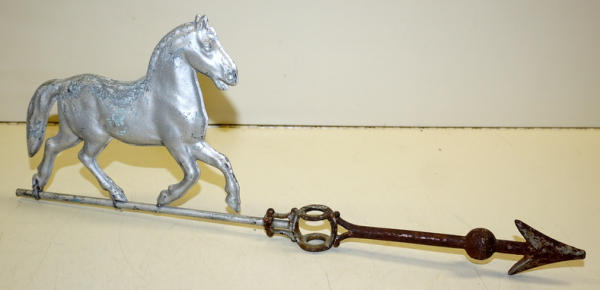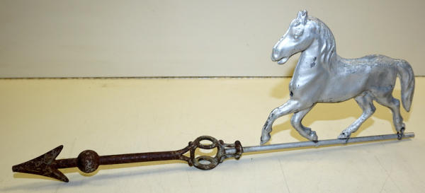 23" long, 8" tall horse, unusual ball at the end of the arrow, horse has been wired to the beam and was repainted at one time,