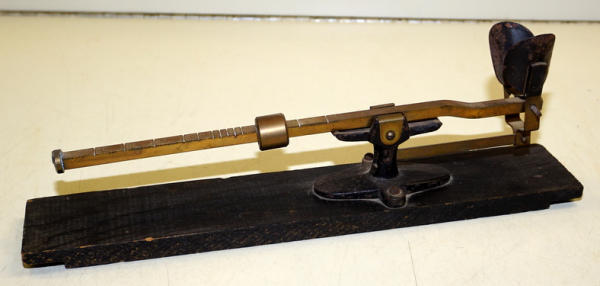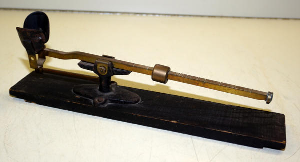 12.5" long, wood bottom, cast iron mount with brass beam; I don't see a maker's mark