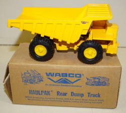 Toy is near mint original with large decals on the side and pan; does not have the wheel hitch, overall rates 97% near mint condition; box is square, some soiling and ageing, rates 8 condition