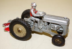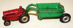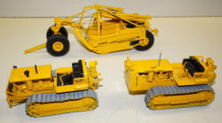 Tractor is a near mint original paint; I think the first time I've seen original yellow tracks on a Reuhl D-7; but they are very poor condition; 3-tin ripper is also near mint; comes in the original, unmarked box, but has spots for the two pieces inside; a set we have never sold (or even knew existed) until now