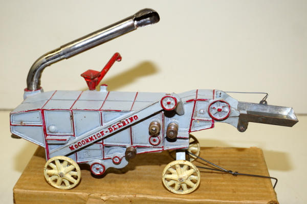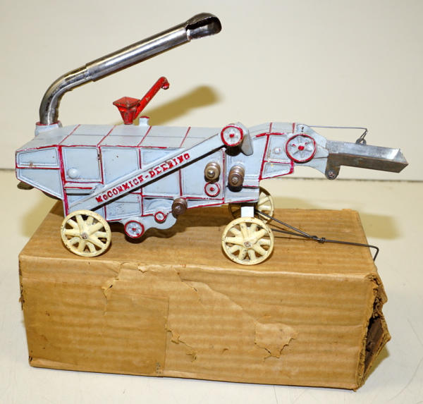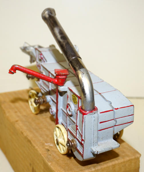 Super clean, near mint original threshing machine; Box is the corrugated cardboard version with the stamp on the end; box has some large tears in the sides, missing one inside flap; not the best box, but very a rare box in any condition