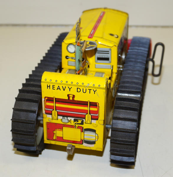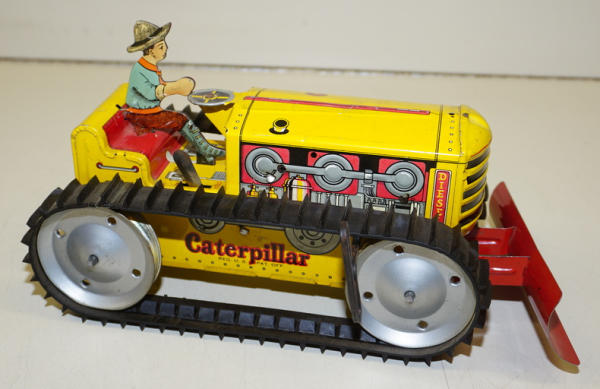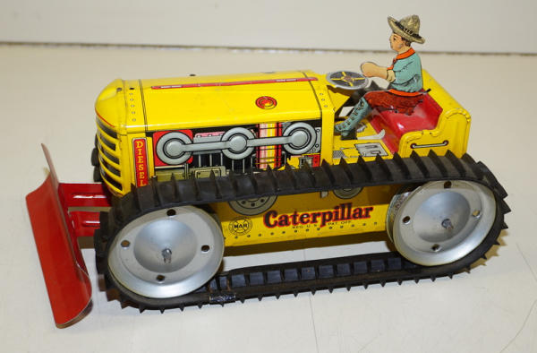 9" long plus the blade, windup works, one of the tracks has been repaired, paint is 90% condition