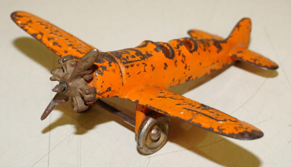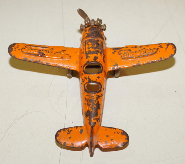 6" long, 7" wingspan, one blade on the prop is repaired, 75% paint