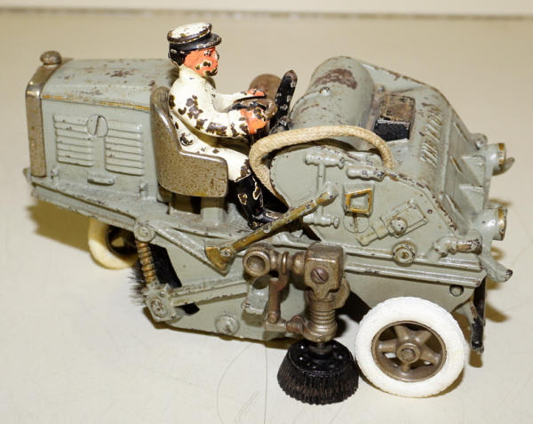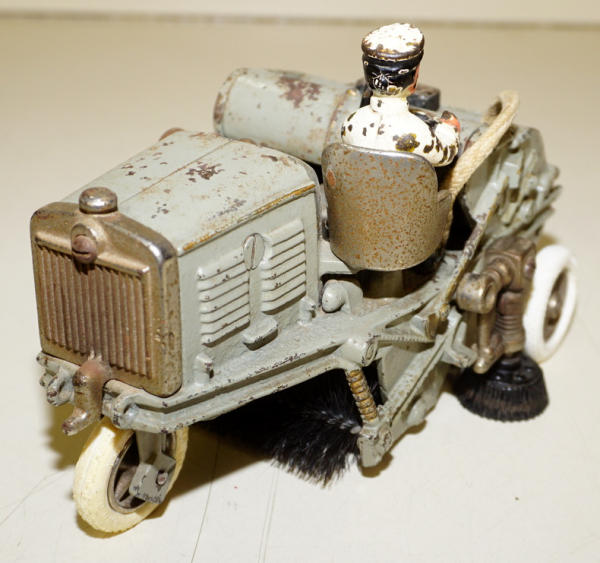 8.5" long, mostly original paint about 80%, looks like some replaced parts, the wheels and the side scrubber, Driver might be a replacement too; overall a really great looking and impressive cast iron toy