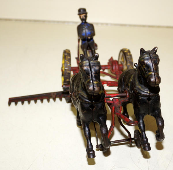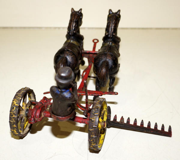 10" long, I see no damage or repairs, paint is about 60% overall; nearly no paint left on the rider; rare Pre-1900's production cast iron toy; often considered one of the first farm toys ever produced!