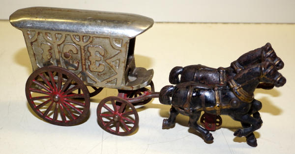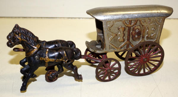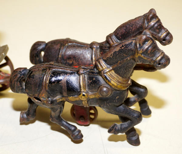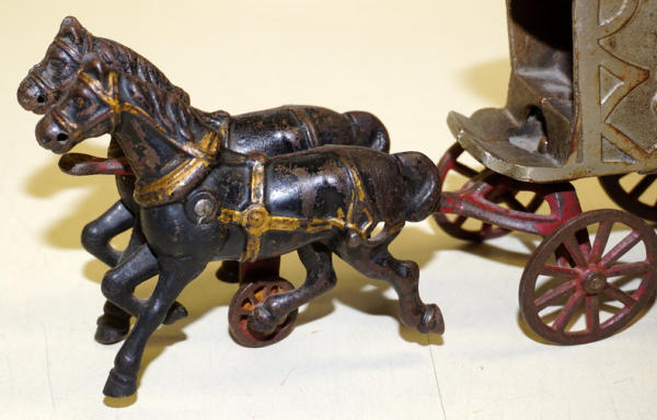 12" long, Nickle finish is about 80% condition, original paint on the horses, neat toy