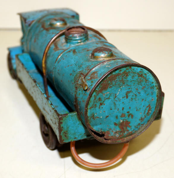 13" long, paint is about 70%, has some green paint on one side of the bed; tanker is dented up, missing the cap and has a hole in the back