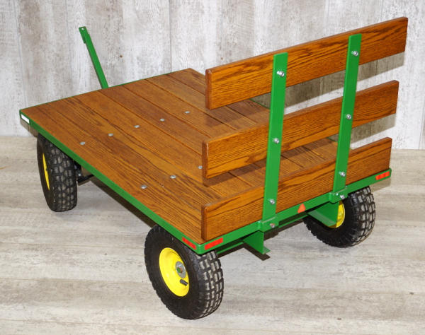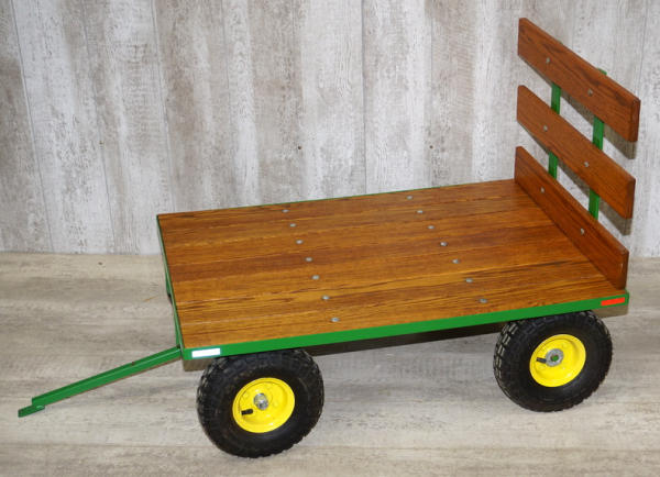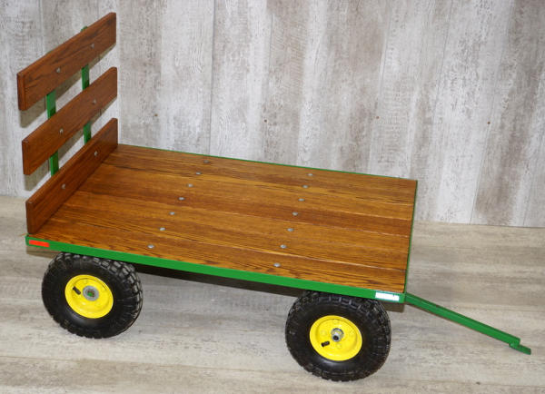 air tires, heavy steel frame, heavy oak deck and back board, bed is 25"x26", very heavy built