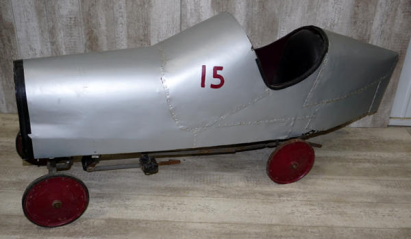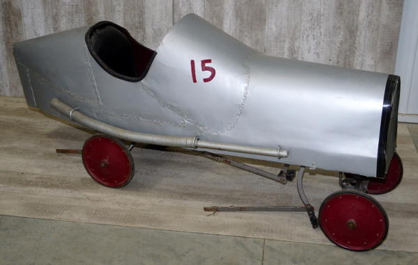 6' long, hand built probably 50+ years ago, needs some new rubber on the tires, has a pedal assembly, I'd say a small adult could fit inside, unique piece