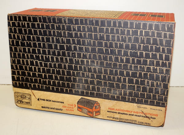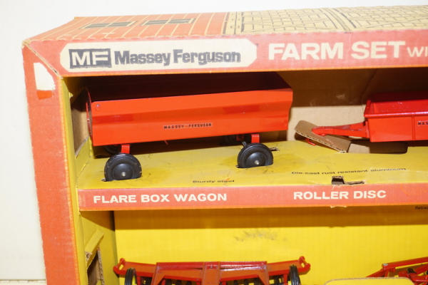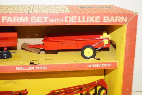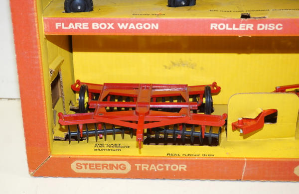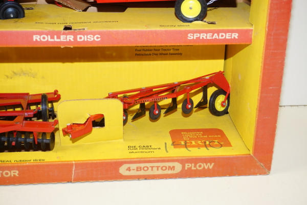 has the 4 yellow wheel implements, but no tractor, box has some discoloration and wear, has the divider, overall box rates 7.5 condition