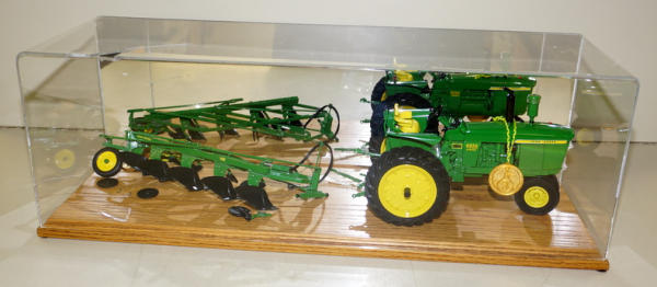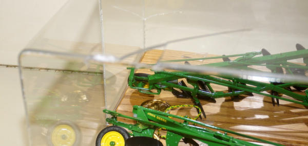 Tractor looks fine, plow has several broken pieces, showcase is also broken at the top, good piece to due some customizing too; no boxes; no shipping, too fragile