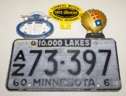 #318 - 1960 MN License Plate w/ 3 Toppers--Farmer's Mutual, Shell, & ALA