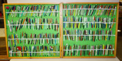 23"x29"x5", heavy oak with shelves drilled to hold pencils; no shipping, local pickup only