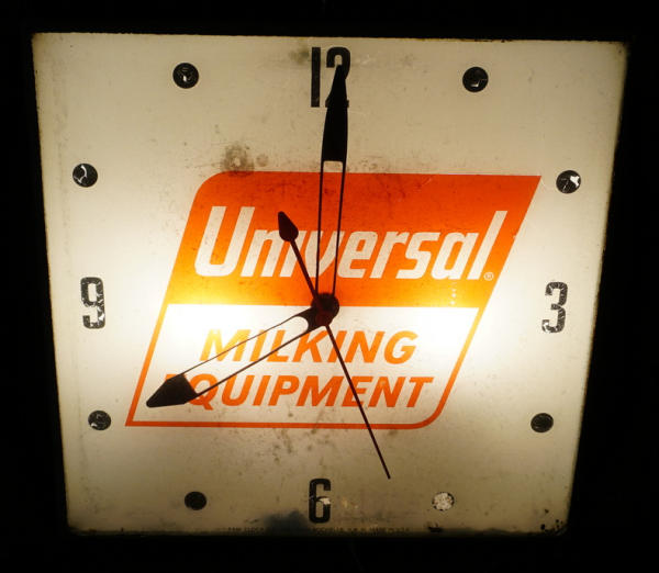 15"x15", face has some flaking mainly to the black numbers, works, frame is rusty