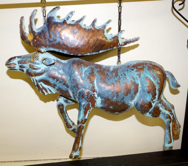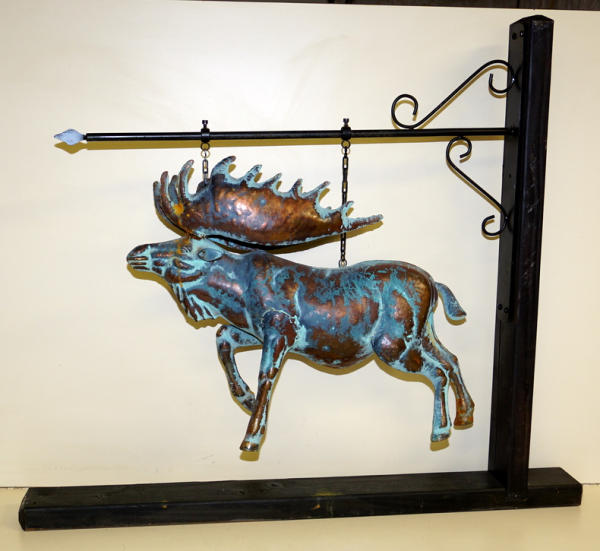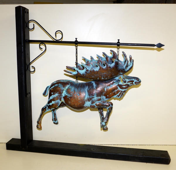 Moose is 22" long and about 19" tall, damaged at the base of one antler, comes with a wood stand and steel hanger for display, again, I don't think very old, within the last 20 or so years